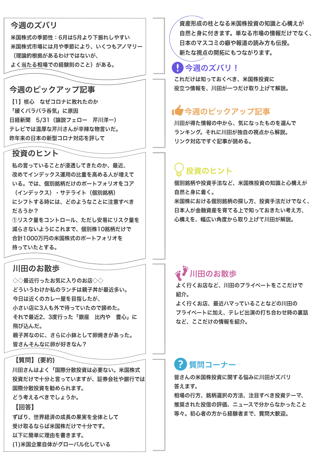 例えば、メルマガの最初にある1週間前の相場動向は、毎日の動向を詳しく書いているバージョンから100字程度の簡単バージョンまで、様々な読者ニーズに合わせています。同様に、新聞記事のピックアップや投資のヒントなどもいろいろな角度から取り上げているので、初心者の方も経験者にも役立つ内容です。分からないことや疑問に思ったことはお気軽に質問コーナーでお聞きください。